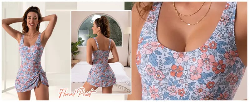 Flattering swimsuits for women: this bathing suit combining the full coverage of a swim dress and functionality of a one piece swimsuit. It allows you to play at a water park without worrying about floating up.